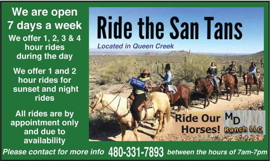 MD Ranch LLC is a small family owned business established in 2010. One day we wondered what we could do to to help supplement the cost of feed for our horses. So we thought, why not take vistors for horseback rides. We started this business with only 6 horses. The business took off!! Visitors were calling and we were getting busier and busier. So now after 11 years of taking visitors on rides and doing our best to accomodate the public we have quite a few more horses than we started with. We love what we do and enjoy meeting all the different people from all over the world. We offer a variety of rides from a personal date ride with a loved one to a group ride with the family. Our rides feature scenic views of the Superstition Mountains and the Sonoran Desert.